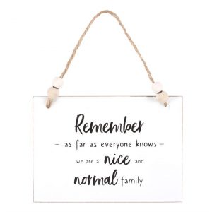 The perfect token gift for family and friends, this white wooden hanging sign features the text ‘Remember, as far as everyone knows, we are a nice and normal family’. Approximately 10cm x 14cm with twine hanger and finished with a wooden beads.