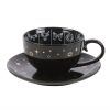 This black celestial teacup can be used for reading tea leaves which are interpreted to predict the future or gain insight into one’s life. Featuring an astrology wheel design with signs of the zodiac in a premium, white and gold finish, and accompanied by a matching black saucer. The design guides the reader to make connections between the shapes of tea leaves and astrological interpretations. 500ml capacity. Handwash only and not microwave safe.