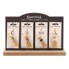 This display of lucky crystal broomstick car charms feature 4 magickal designs perfect for attracting luck, peace, protection and love. The charm designs include a crescent moon with green aventurine crystal chips, a pentagram with amethyst crystal chips, a triple moon with black onyx crystal chips, and a witch hat with rose quartz crystal chips. Sold as a set of 24 with 6 of each design on a matching mdf countertop display.